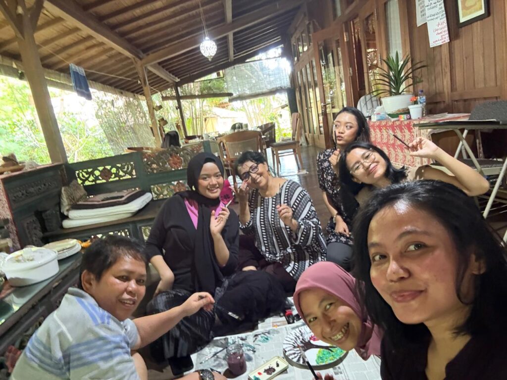 Entah kenapa, melukis piring kali ini terasa seperti lebih dalam saja, rasaya seperti membalik fungsi benda sehari-hari. Piring kan akrab dengan dapur dan kerja domestik, ya. Tapi sekarang, untuk sementara piring itu berubah jadi medium ekspresi, dan senangnya kami karena tidak perlu memikirkan tuntutan estetika dan takut dibilang jelek. Kami melukis sambil berbincang ringan, sesekali tertawa, dan berfoto selfie.