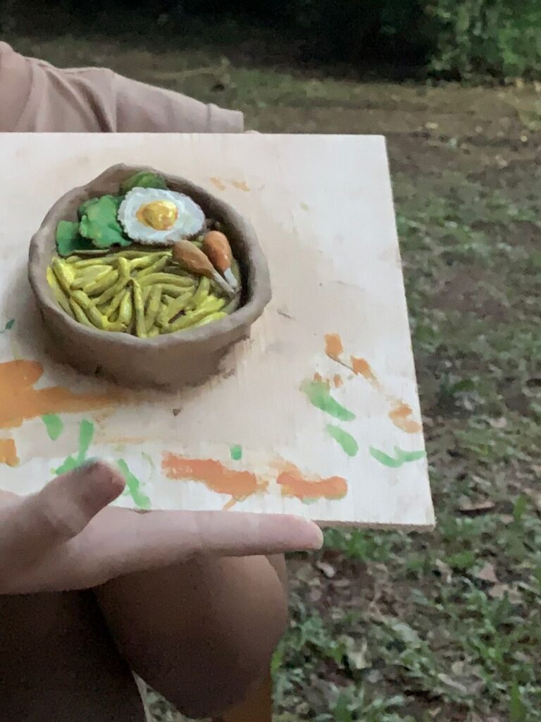 Piring-piring itu, semoga menyimpan ingatan kolektif tentang alam (ibu bumi) yang dieksploitasi dan mengingatkan kita pada yang dipaksa bertahan di atas puing-puingnya. Melukis di atas piring membuat kami sadar bahwa krisis ekologis bukan isu jauh yang hanya layak dibicarakan di ruang seminar yang fancy itu, tapi lebih dekat lagi, wacana ekologis justru sesuatu yang hadir dan memberi dampak di meja makan, di rumah, dan di tubuh sehari-hari, karena tentu saja tubuh perlu gizi! Dan gizi hanya akan terpenuhi apabila kita memiliki lahan yang baik. Bukan begitu?